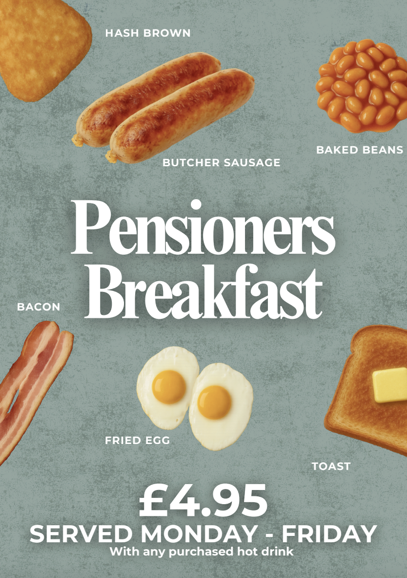 Our Pensioners Breakfast is specially designed for our older guests, offering a hearty and satisfying start to the day at a great value. Enjoy all your traditional favourites, freshly cooked and served with care, perfect for a relaxed morning with a hot drink!